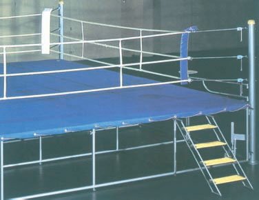 Боксёрский ринг на платформе, соответствующий правилам AIBA. Подходит для проведения международных совревнований. Высота платформы 100 см. Чрезвычайно устойчивая сборно-разборная конструкция из стали. Пол из прочных деревянных панелей покрыт плотным ковром из пено-поролона 15 см и прочного брезента, натянутого и надёжно закреплённого по периметру. Над полом платформы возвышаются четыре угловые стойки, на каждой из которых установлены натяжные устройства. С каждого угла по три прочных натянутых троса держат ринг в подвешенном состоянии. Углы ринга оснащены цветными защитными подушками. Канаты ограждения ринга покрыты белой мягкой текстильной защитой. В комплекте к рингу прилагаются два табурета для перерывов (в красный и синий угол). ![]()
