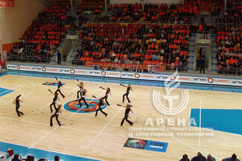 Профессиональное баскетбольное оборудование Schelde Sports. Система игровых электронных табло Nautronic. Система спортивного пола CONNOR RezillChannel. Защитное покрытие CoverMaster. Рекламный стенд OndaVision.