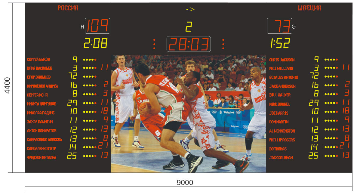 Существуют различные комбинации электронных табло и боковых панелей, которые соответствуют требованиям официальных правил FIBA для Уровня 1. Несколько примеров приведено на данной странице. Если вы здесь не нашли необходимой Вам комбинации, пожалуйста, обращайтесь в наш офис (телефон/факс: +7 (495) 363-12-42).